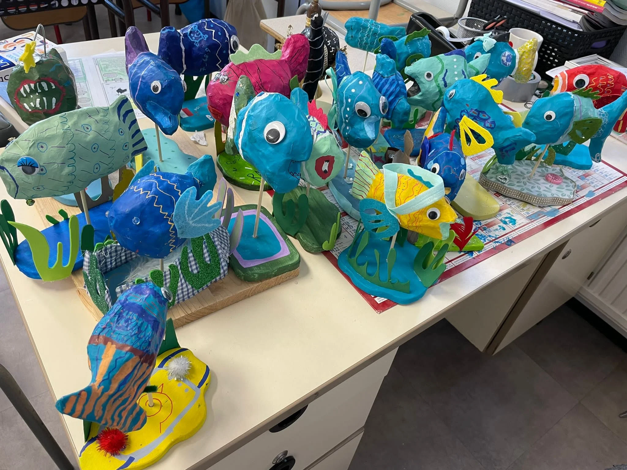 On échange sur le thème désiré et je prépare la base du projet, pour que le résultat soit esthétiquement réfléchit et joli, je donne la direction, je prépare une partie des supports à peindre (plus ou moins selon l’âge des enfants) découpages, peinture, tampons , quelques jours de joie créative partagée avec les enfants! et la fierté du travail accompli affiché dans l’école.